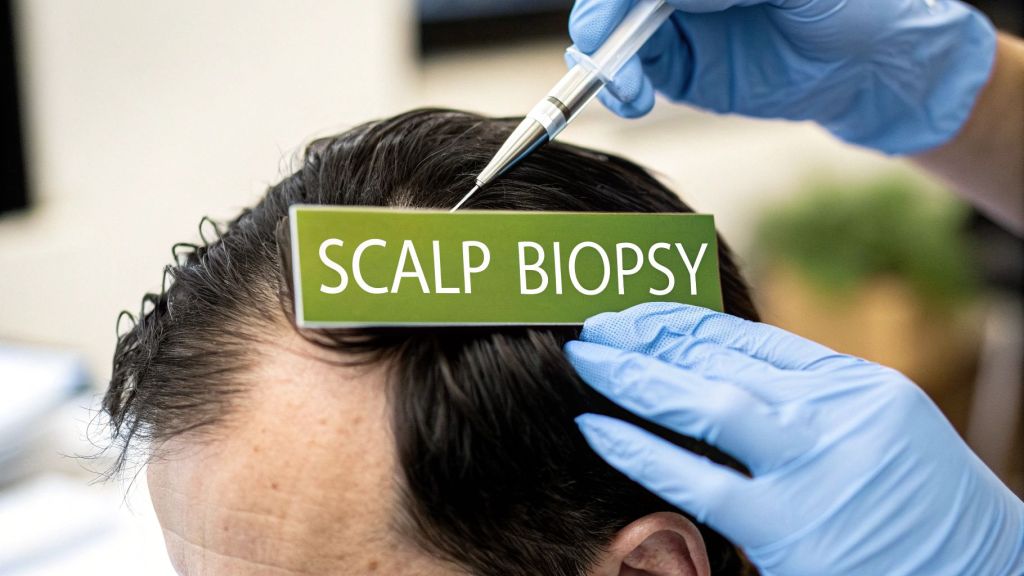 When you're staring in the mirror, watching your hairline change, the not-knowing is often the worst part. A scalp biopsy for hair loss is a diagnostic procedure that cuts through the noise, replacing frustrating guesswork with solid, scientific answers. It’s a simple, minor procedure where a dermatologist takes a tiny sample of your scalp skin to see exactly what’s going on with your hair follicles.